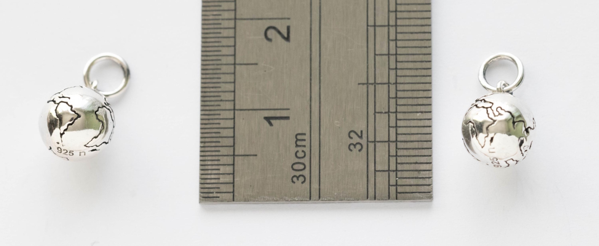 This is a listing for 925 Sterling Silver 3D World Charm Dimensions: 10.3 x 8.1mm Thickness: 8.0mm Weight: 2.8g
