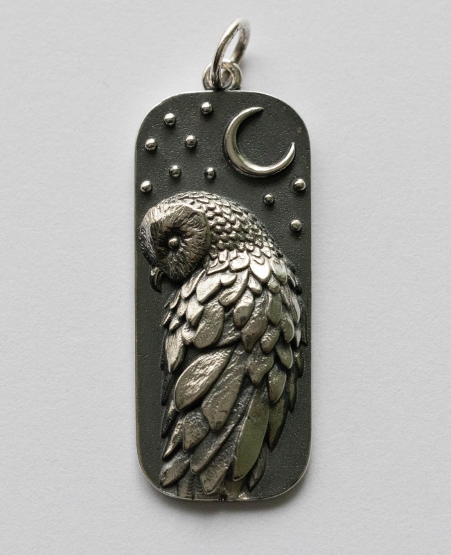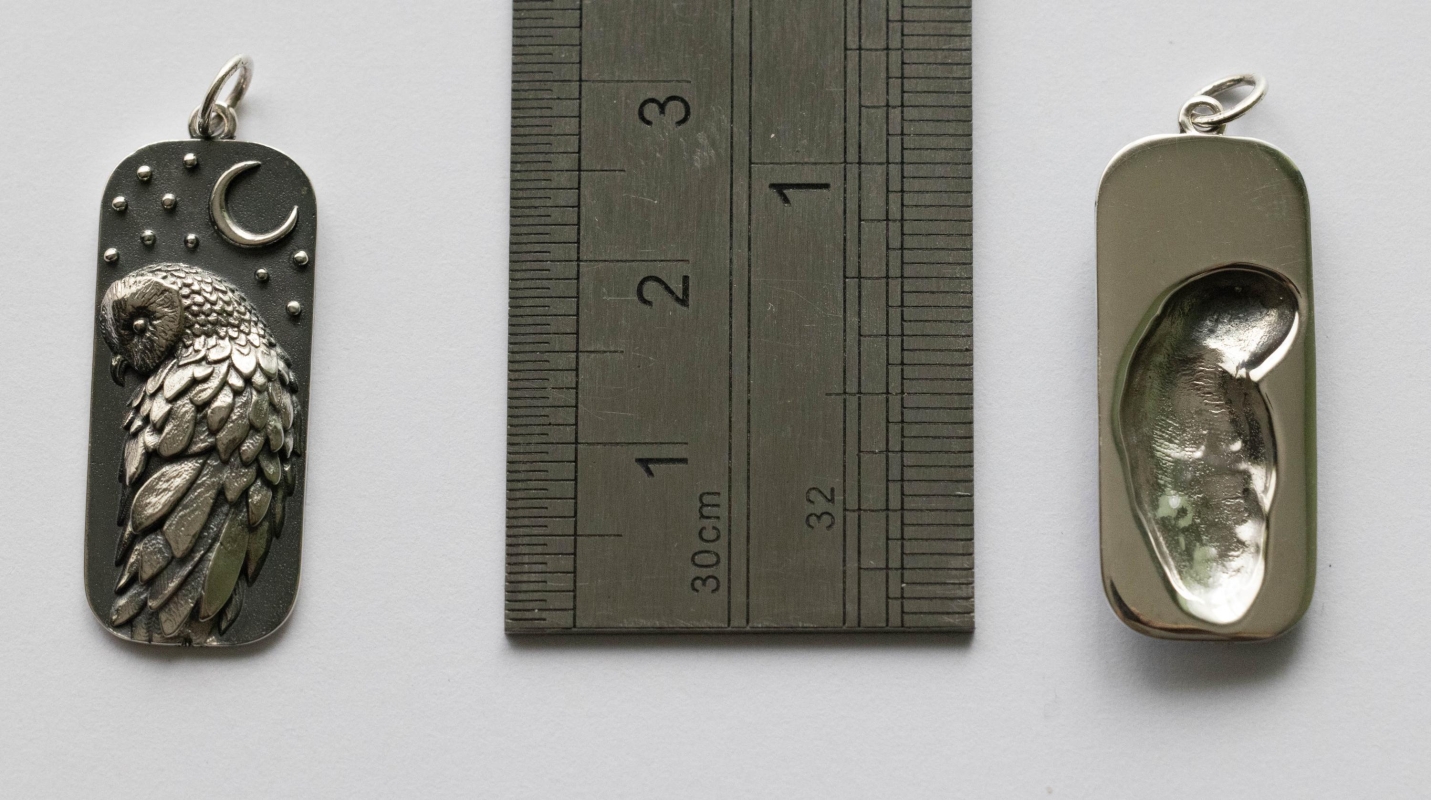 This is a listing for 925 Sterling Silver Barn Owl and Moon Dimensions: 29.8 x 11.8mm Thickness: 3.2mm Weight: 3.2g