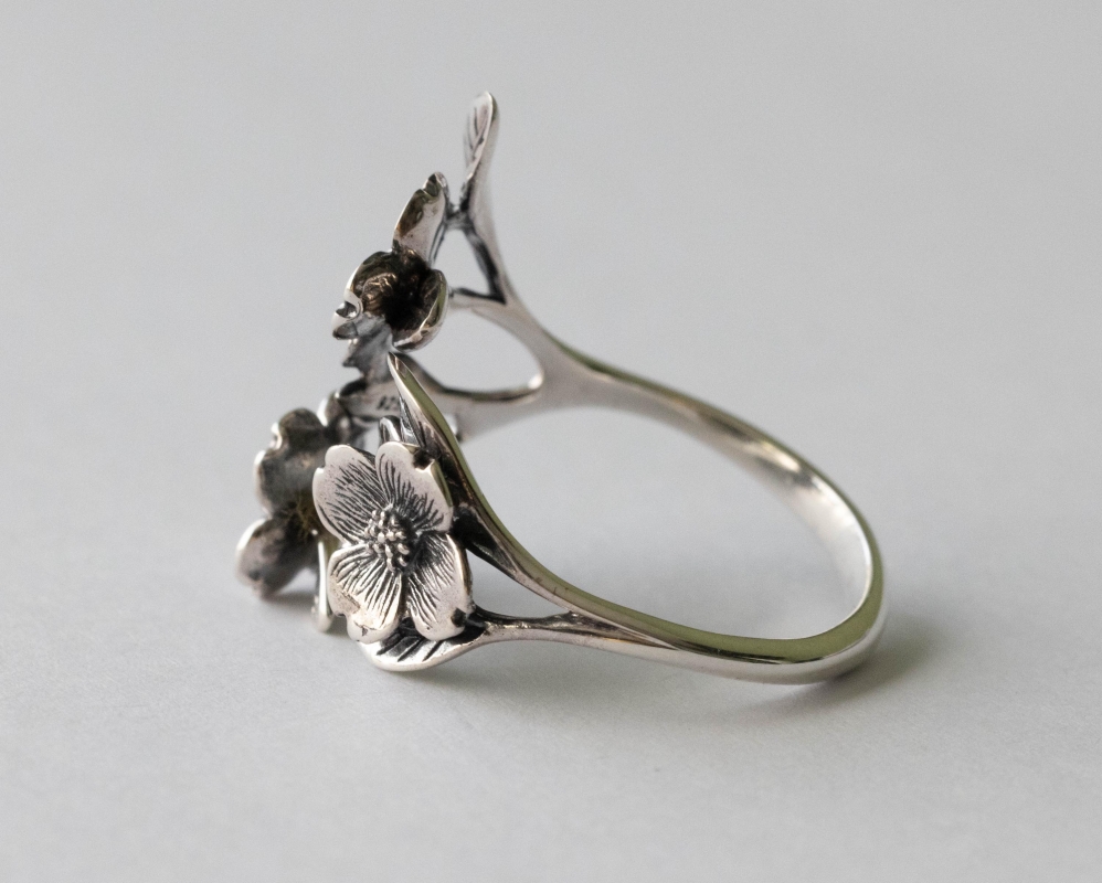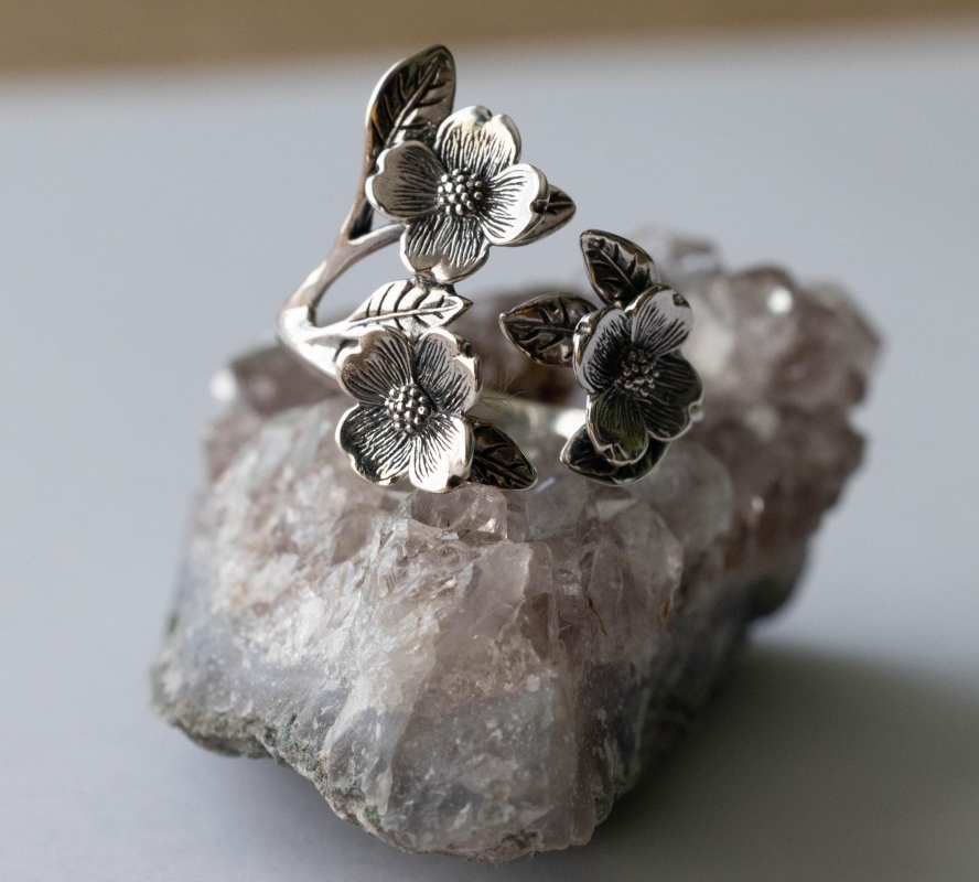 This is a listing for 925 Sterling Silver Dogwood Flower and Leaf Adjustable Ring This ring is made from 100% recycled silver. The adjustable ring sizing starts at size 7, making it ideal for sizes 6-8. As with all adjustable rings, we suggest adjusting this ring to the desired size and then leaving it alone