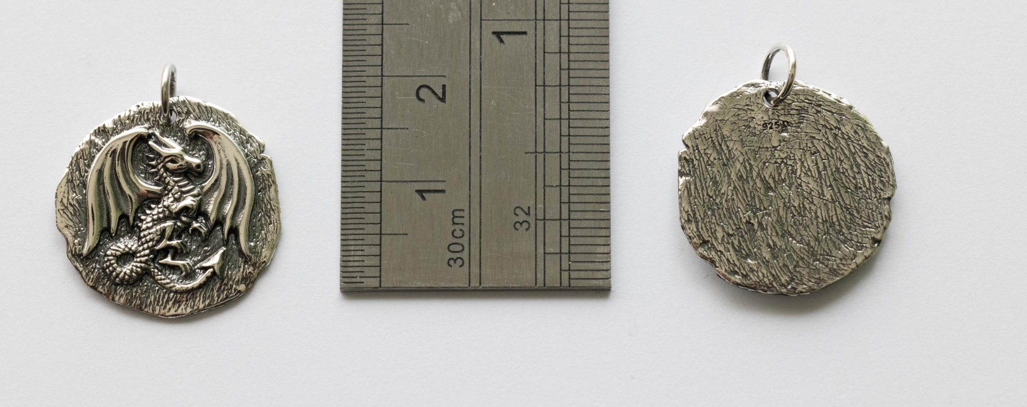 This is a listing for 925 Sterling Silver Dragon Coin Charm Dimensions: 20.6 x 20.4mm Thickness: 2.3mm Weight: 4g
