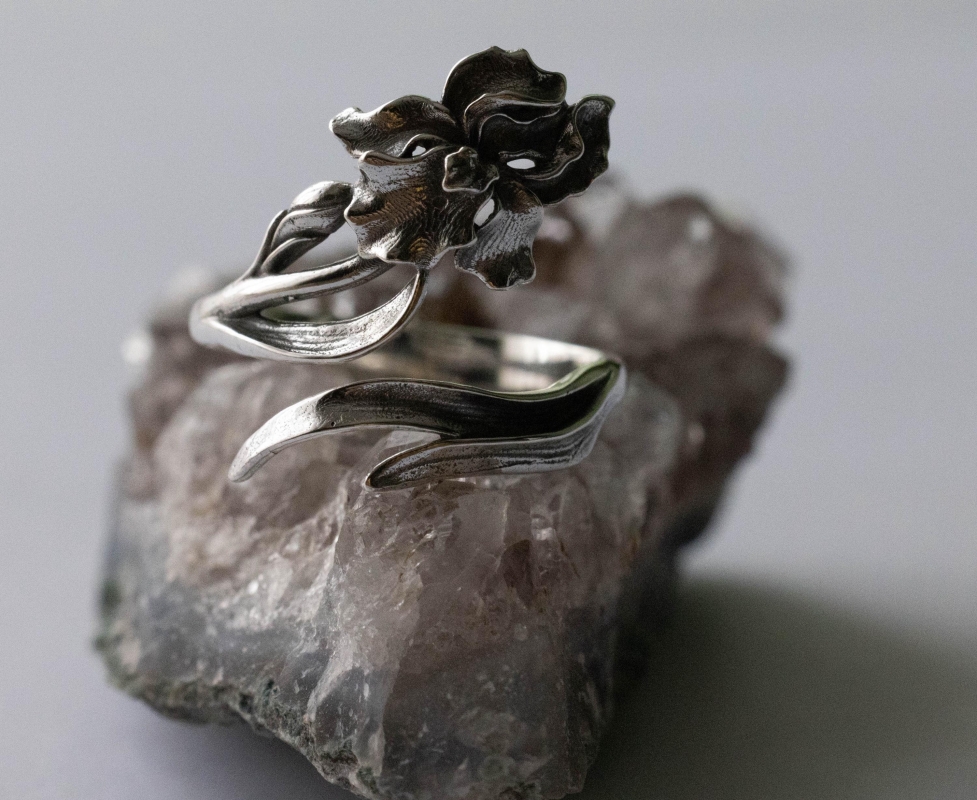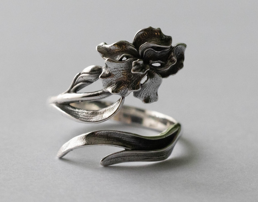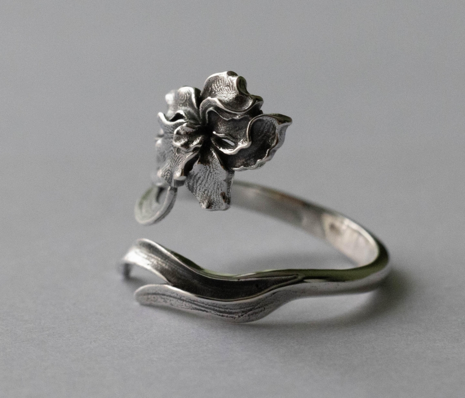 925 Sterling Silver Iris February Birth Flower Adjustable Ring The adjustable ring sizing starts at size 7, making it ideal for sizes 6-8. As with all adjustable rings, we suggest adjusting this ring to the desired size and then leaving it alone