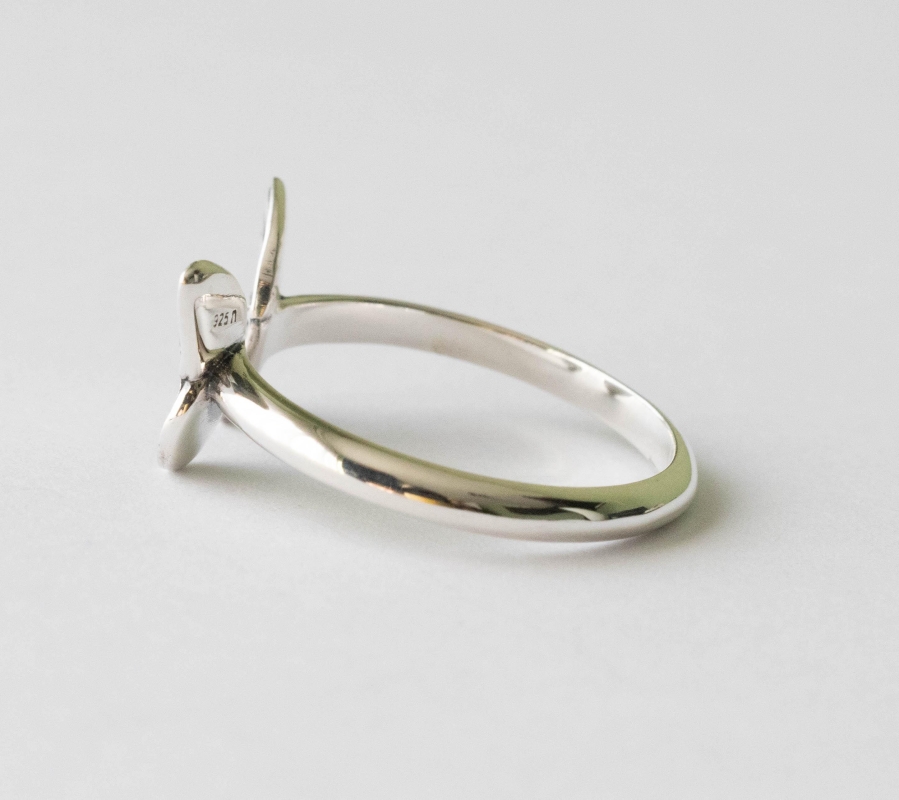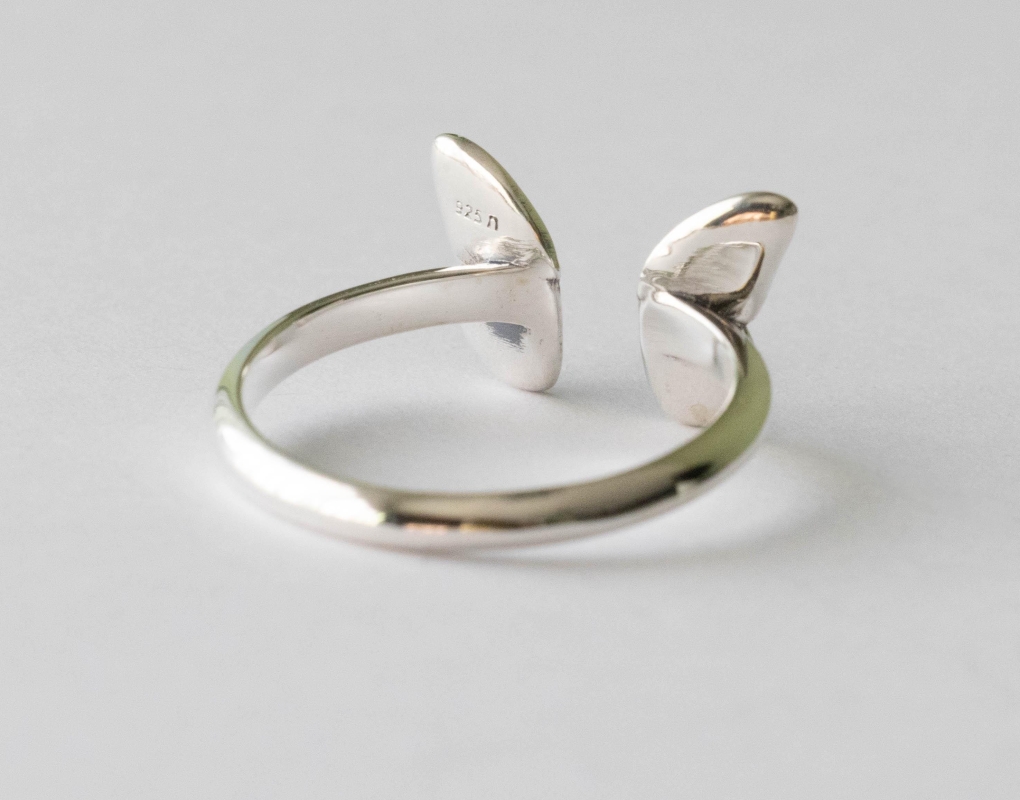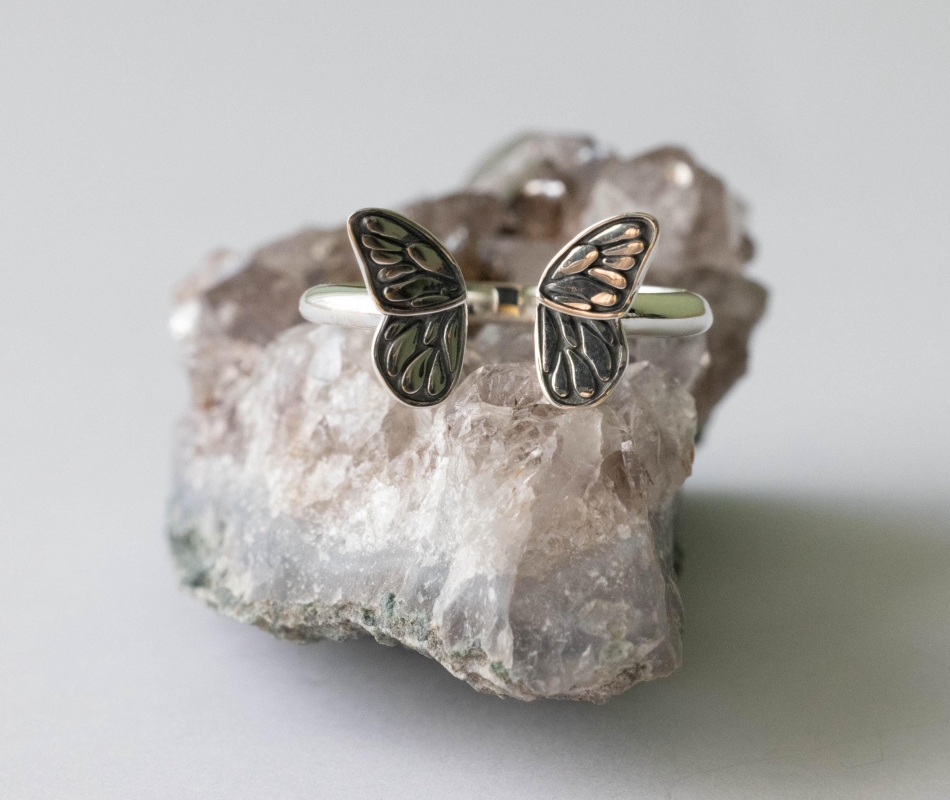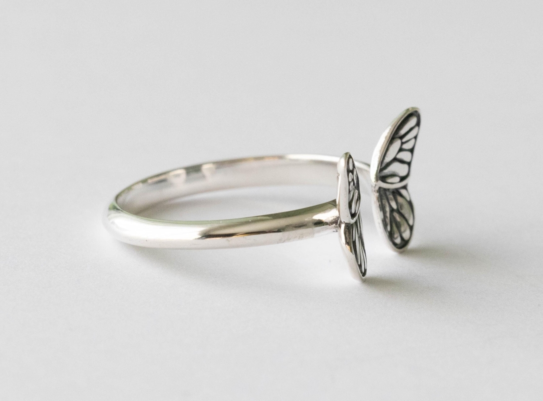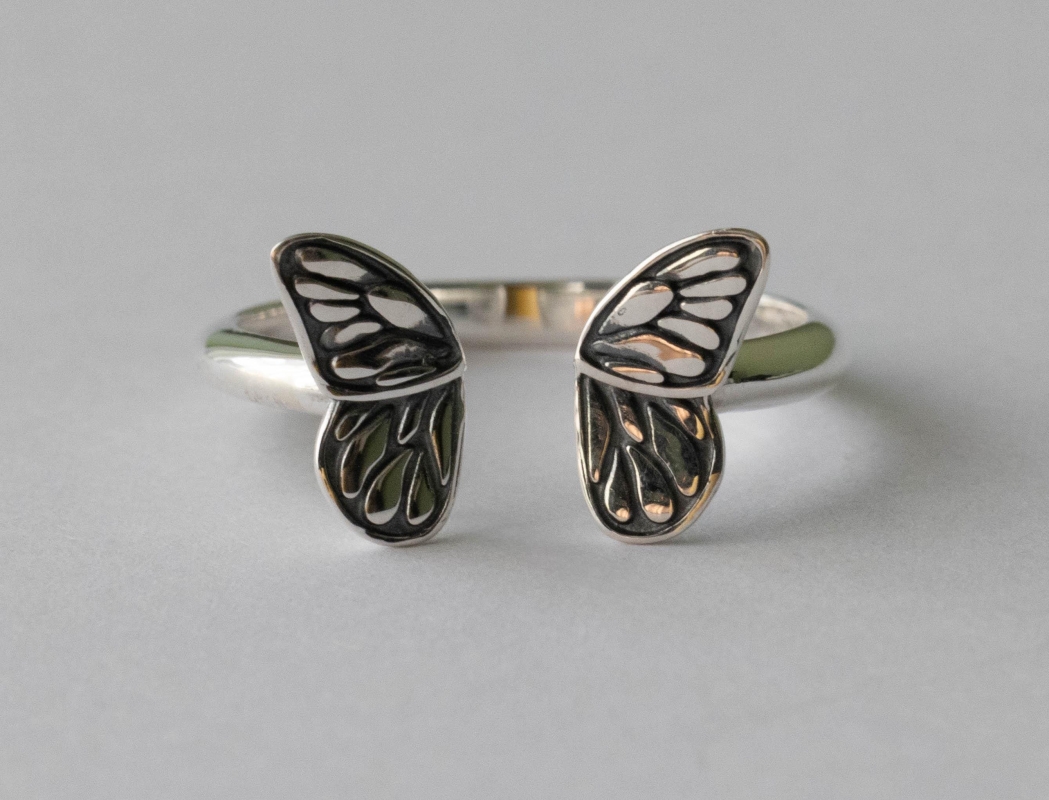 This is a listing for a 925 Sterling Silver Small ButterflyAdjustable Ring. While this butterfly wing ring is adjustable, the wings look best when they’re closer together than farther apart. We recommend wearing a size 7.5 and smaller. Adjusting this ring to the correct size and then leaving it alone. Excessive opening and closing can weaken the band, creating cracks and possible breakage. This ring is made from 100% recycled silver.