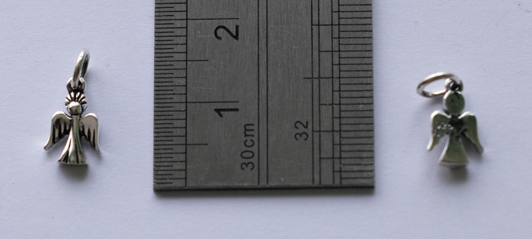 This is a listing for a 925 Sterling Silver Tiny Angel Charm Dimensions: 10.5 x 6.6mm Thickness: 1.9mm Weight: 0.5g This charm is made from 100% recycled silver.