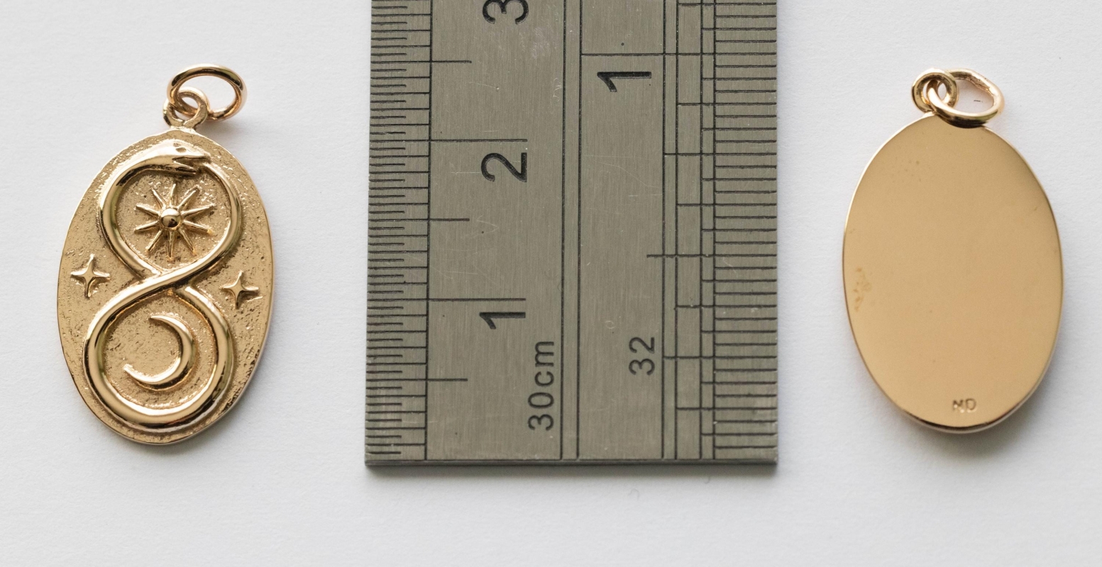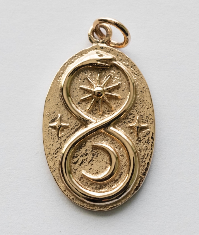 This is a listing for the Bronze Infinity Snake with Sun and Moon Pendant