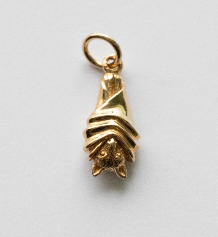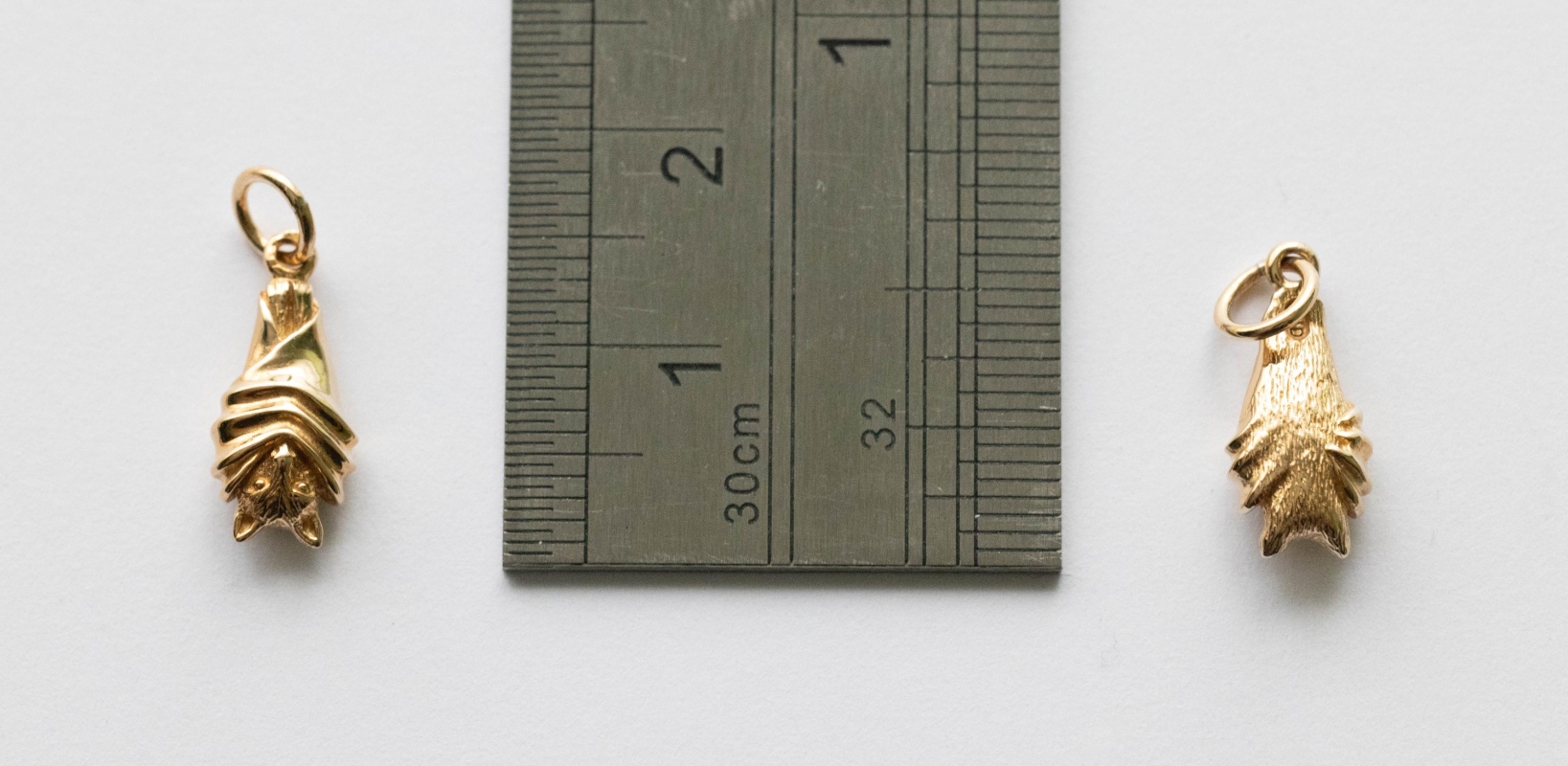 This is a listing for Bronze Small Hanging Bat Charm Dimensions: 14.6 x 6.6mm Thickness: 3.9mm Weight: 1.1g